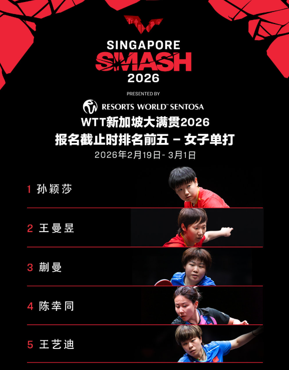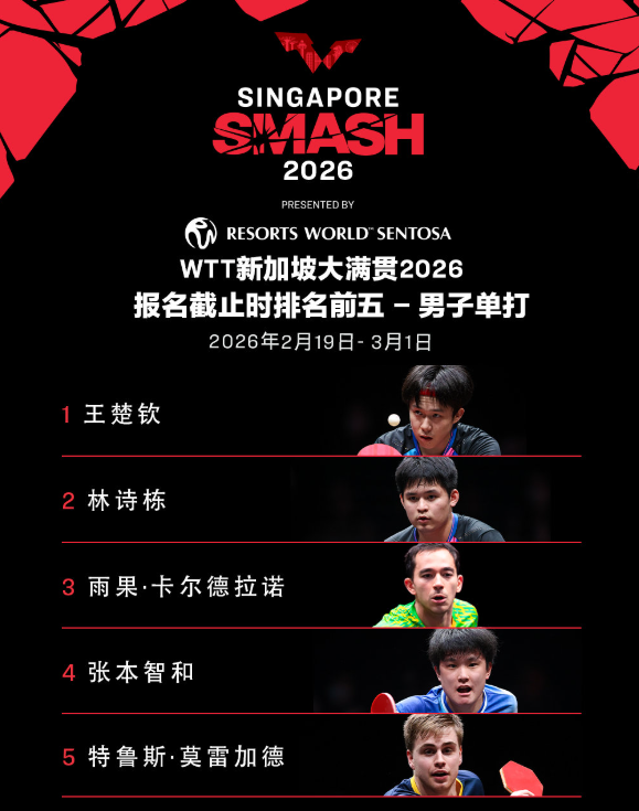 WTT新加坡大满贯2026由新加坡圣淘沙名胜世界呈献宇奇配资,将于2026年2月19日至3月1日在新加坡体育中心举行。届时世界顶尖运动员将齐聚狮城,共同争夺2000点世界排名积分。报名截止时排名前五名单如下: