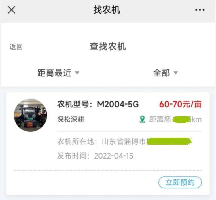 6.点击【找农机】进入页面,可以通过距离、价格、发布时间等筛选查找农机