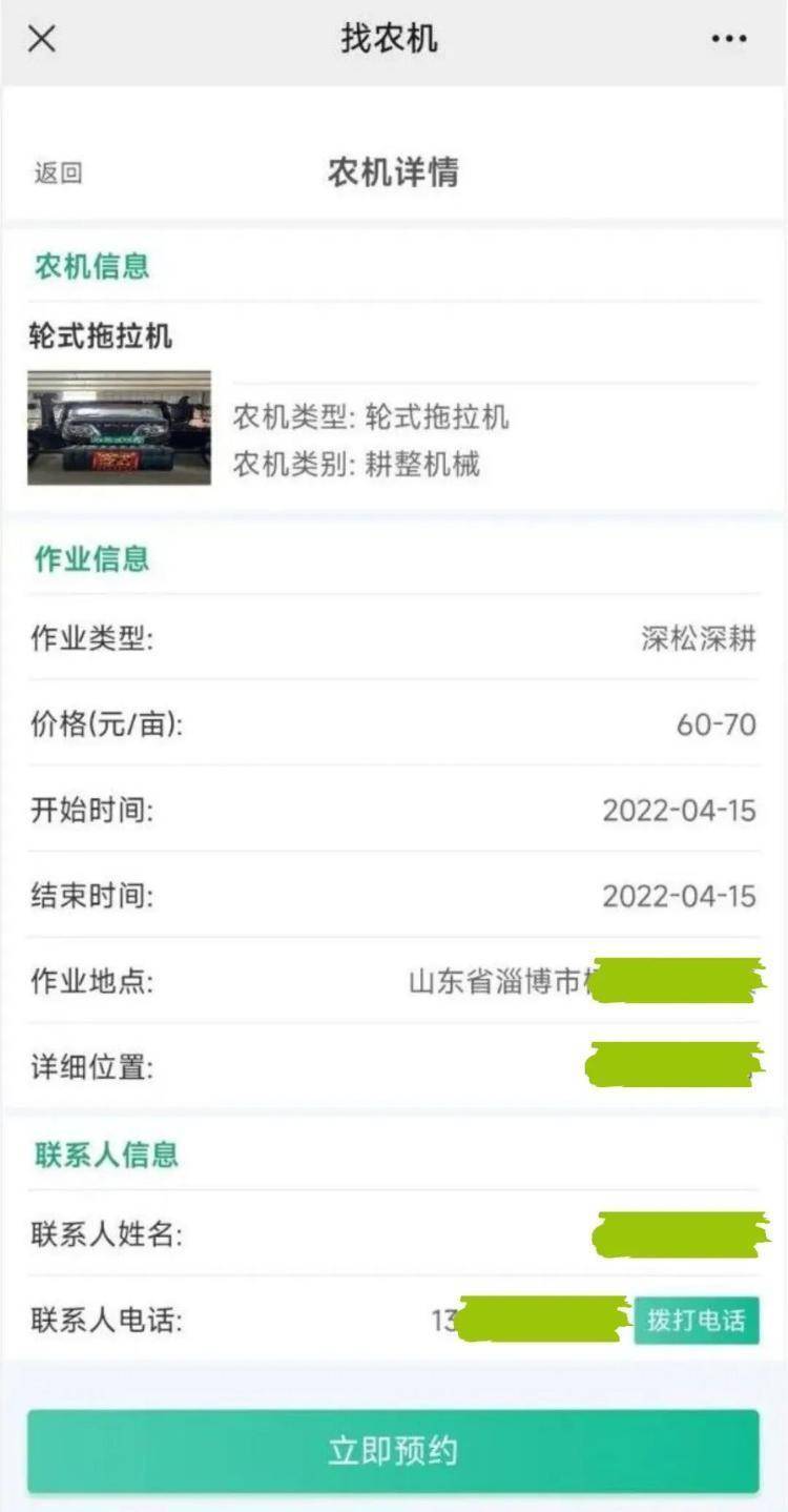 7.点击农机信息可以查看农机详细信息,点击拨打电话可以与机手进行联系。点击【立即预约】可预约服务