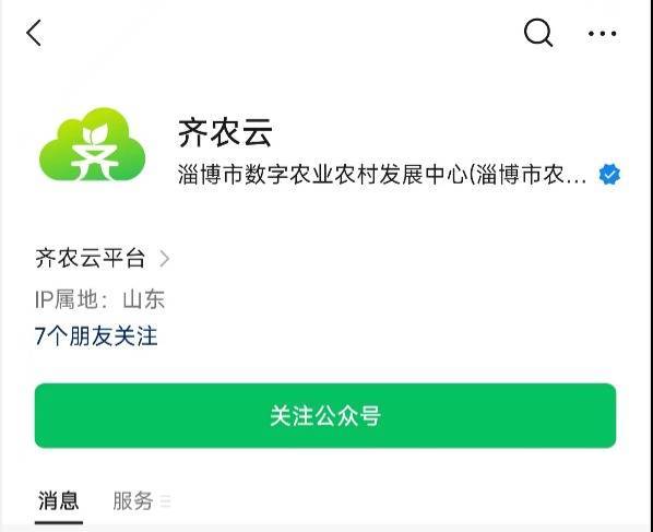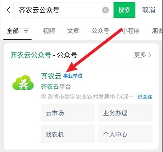 2.输入“齐农云公众号”点击搜索,点击进入齐农云公众号