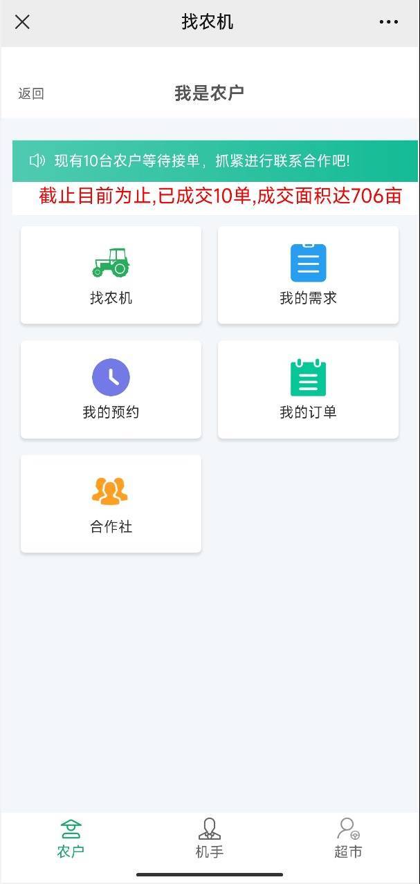 5.【农户】端包含找农机、我的需求、我的预约、我的订单与合作社五个模块。主要为农户使用,用来发布农活信息、处理订单等流程